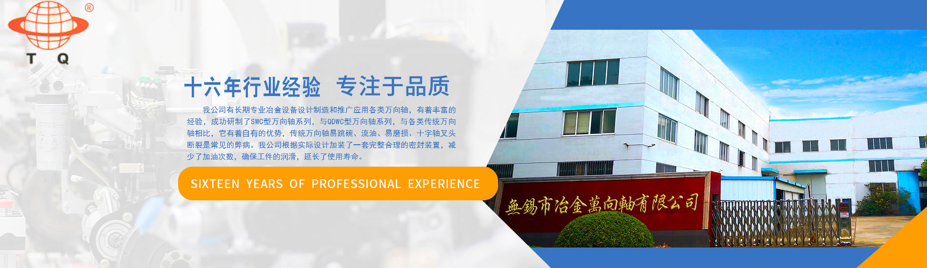 無(wú)錫市冶金萬(wàn)向軸有限公司位于美麗的無(wú)錫太湖之濱--新區(qū)工業(yè)園,交通便利,左臨無(wú)錫機(jī)場(chǎng)(10分鐘路程),右臨滬寧高速新區(qū)出口處(5分鐘路程)。無(wú)錫市冶金萬(wàn)向軸有限公司是由我國(guó)冶金行業(yè)張偉昌先生創(chuàng)辦的一家高科技民營(yíng)企業(yè),生產(chǎn)SWC十字萬(wàn)向聯(lián)軸器。擁有固定資產(chǎn)2000萬(wàn)以上,占地面積18畝。公司技術(shù)力量雄厚,機(jī)械設(shè)備齊全,檢測(cè)手段優(yōu)良。